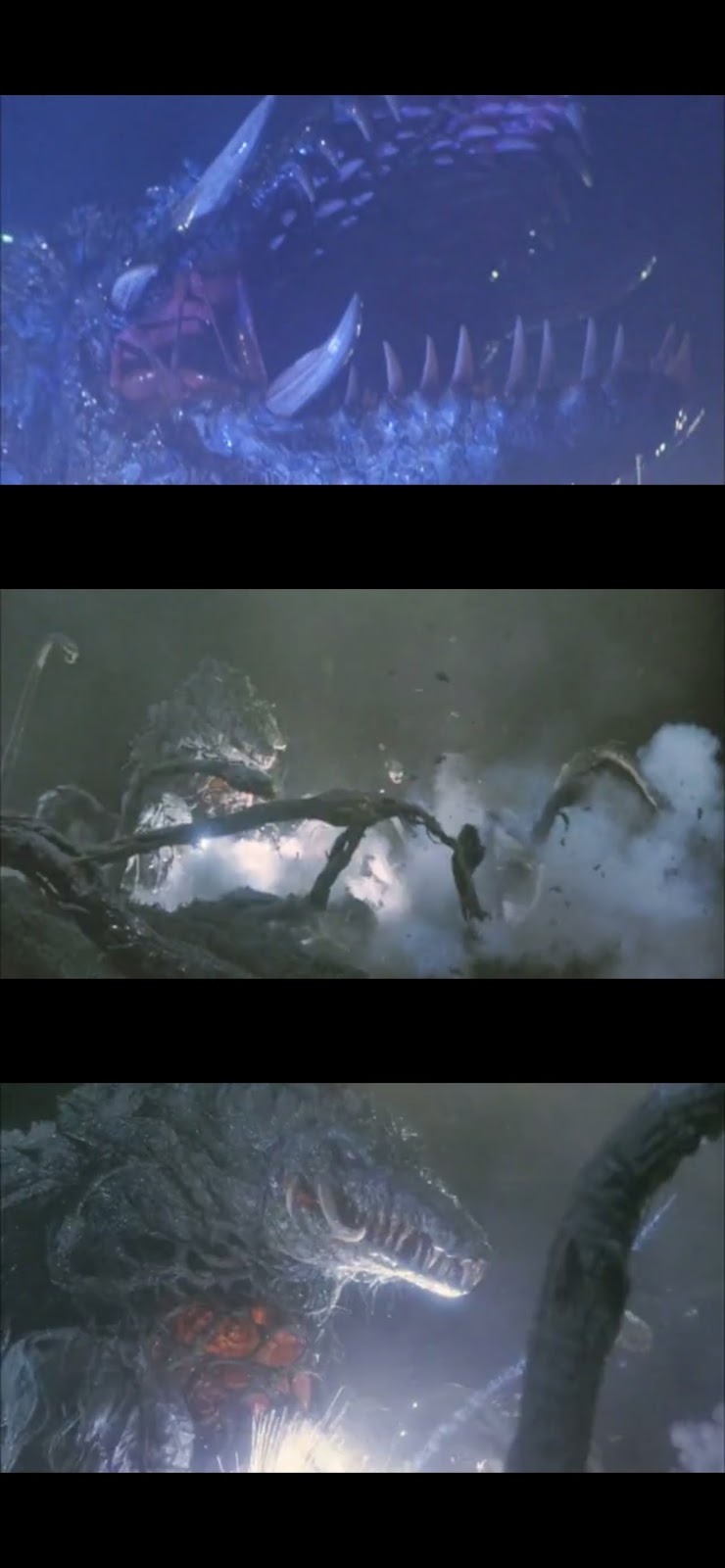 Nyilván nem, de WTF? Aztán Biollante lehányja. És megcsócsálja a fejét. Godzilla belehány B szájába. B agya kirobban! Godzilla összeroskad! A tudós közli a tanulságot!